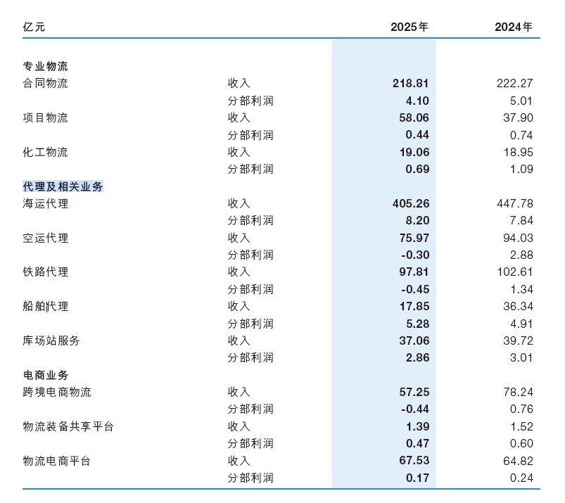 具体到代理及相关业务板块,2025年,中国外运对外营业额为570.10亿元,同比下降15.13%;分部利润18.57亿元,同比下降17.41%。
