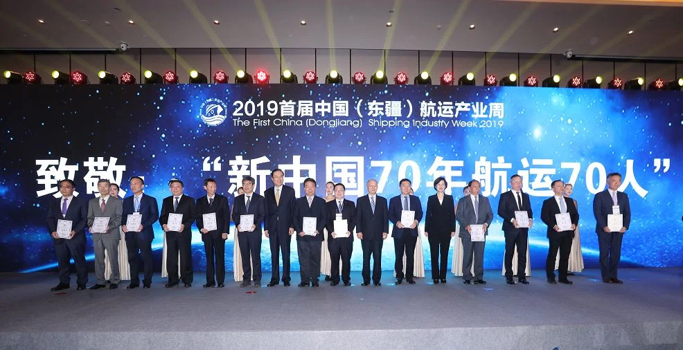 国际海事组织大使、交通运输部原副部长徐祖远,中国航务周刊社长倪玮,东疆保税港区管委会党组书记、主任沈蕾为“新中国70年航运70人”入选者代表颁发证书